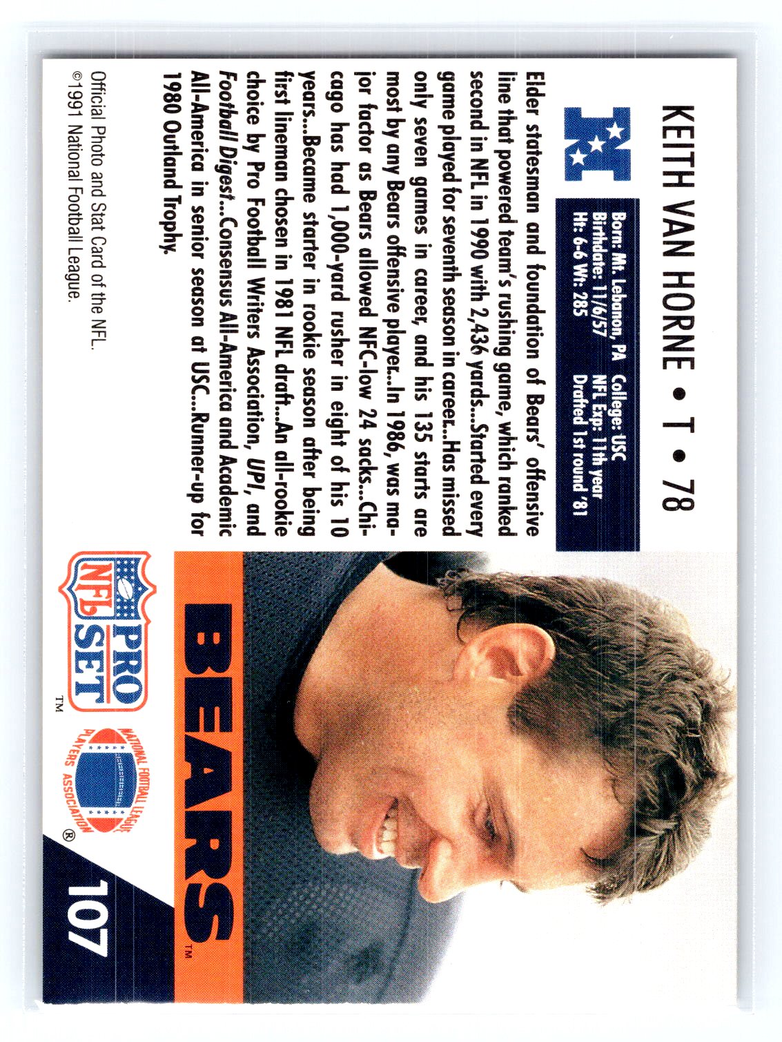 In 1991 Keith Van Horne played for the Chicago Bears.
