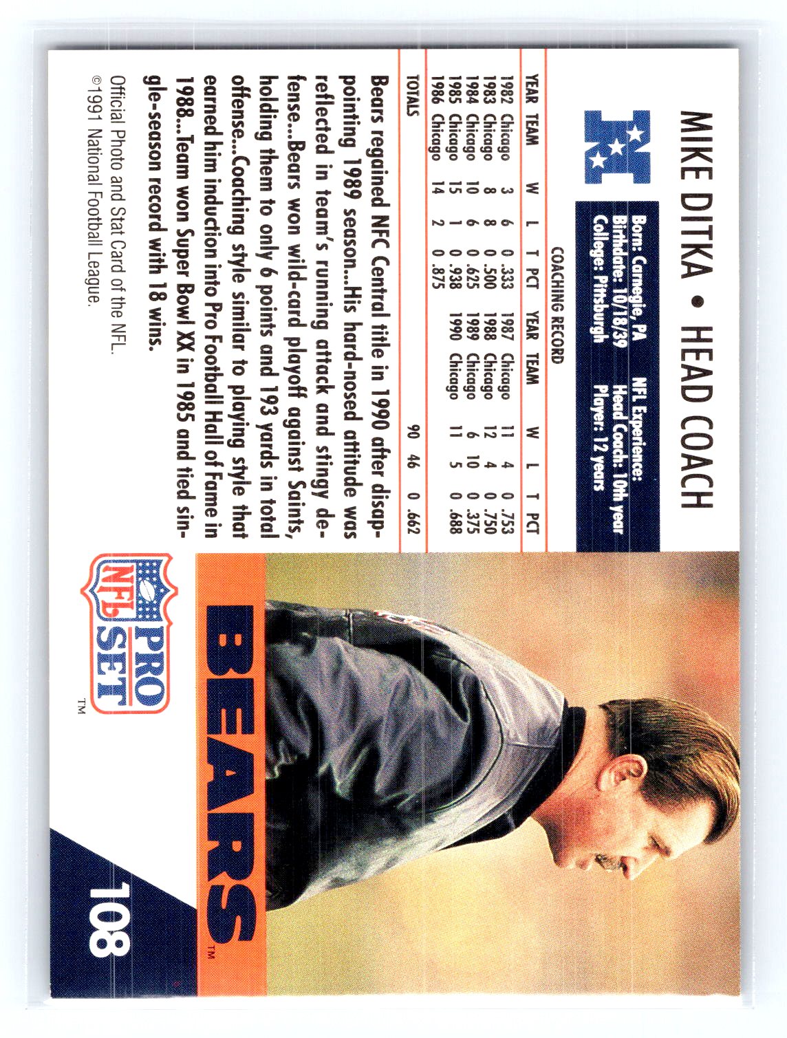 This is a really nice example of a 1991 Pro Set #108 Mike Ditka .