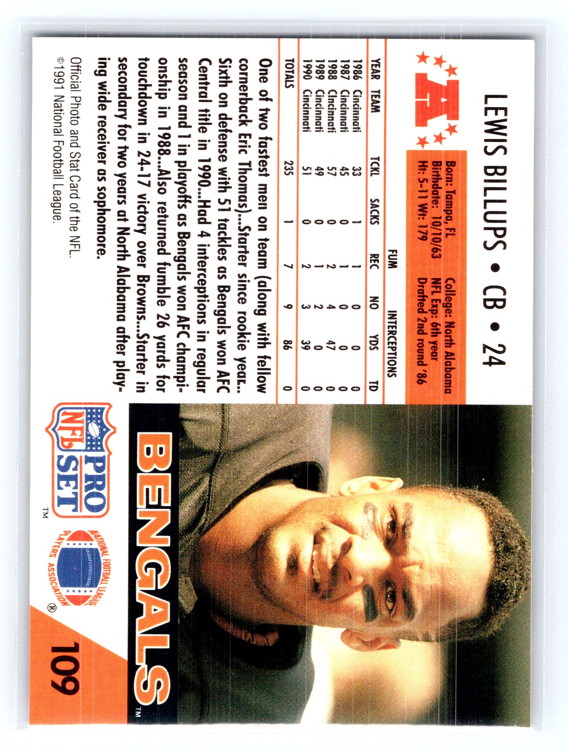 This is a really nice example of a 1991 Pro Set #109 Lewis Billups .