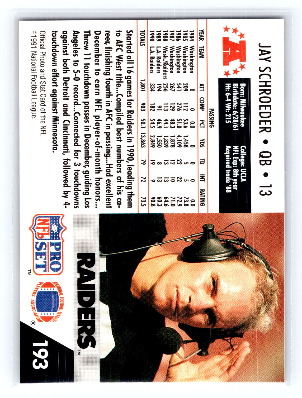 This is a really nice example of a 1991 Pro Set #193 Jay Schroeder .
