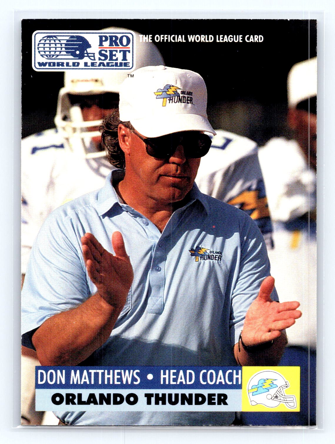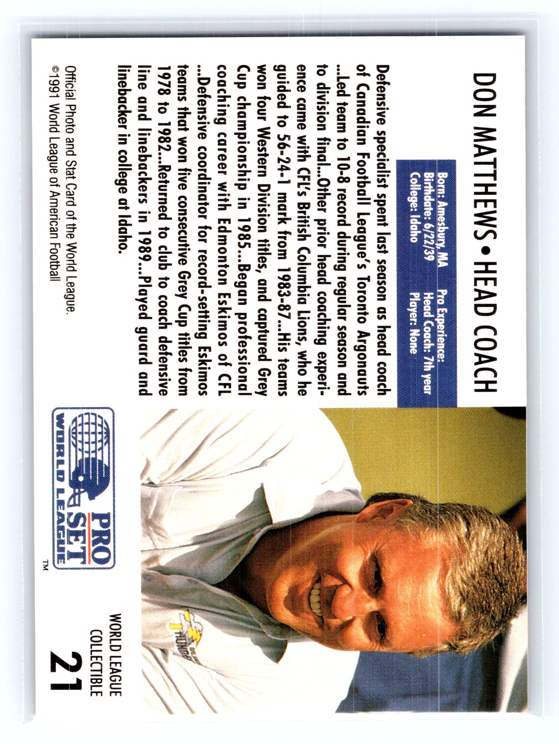 This is a really nice example of a 1991 Pro Set #21 Don Matthews World League Collectibles (WLAF Inserts).
