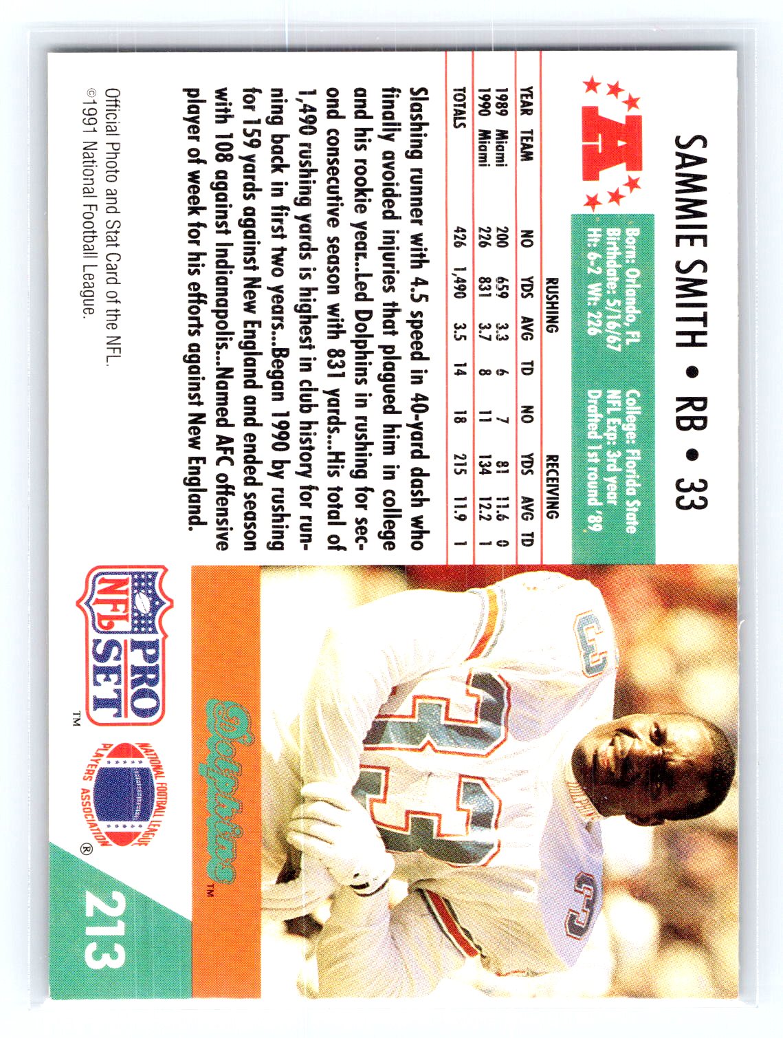 This is a really nice example of a 1991 Pro Set #213 Sammie Smith .
