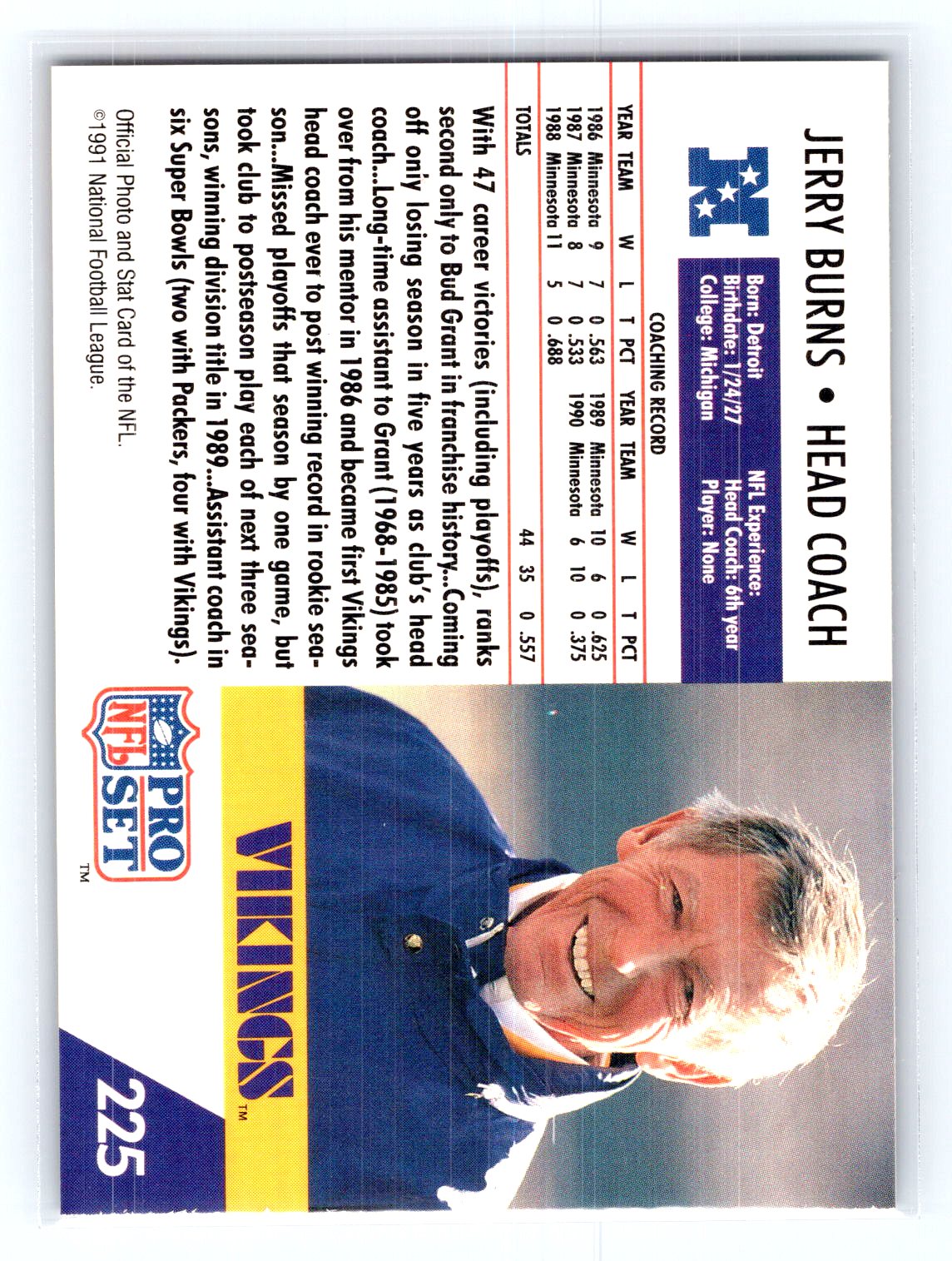 This is a really nice example of a 1991 Pro Set #225 Jerry Burns .