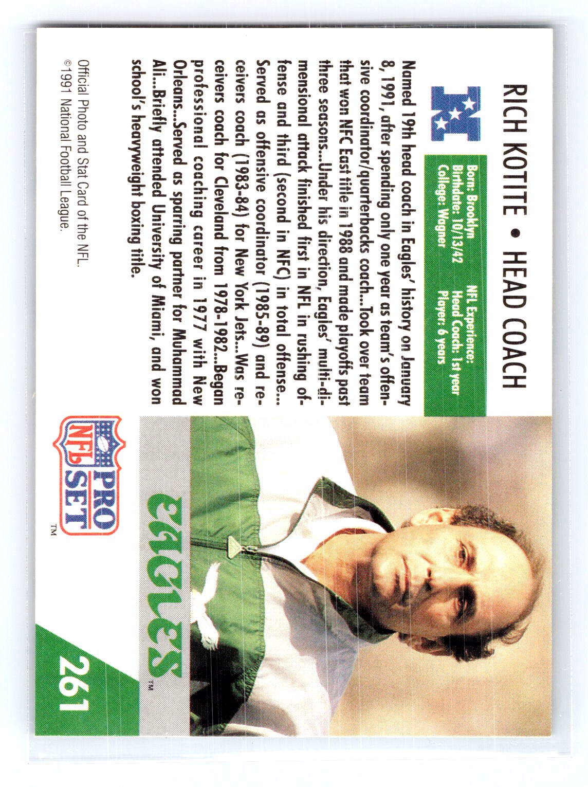 This is a really nice example of a 1991 Pro Set #261 Rich Kotite .