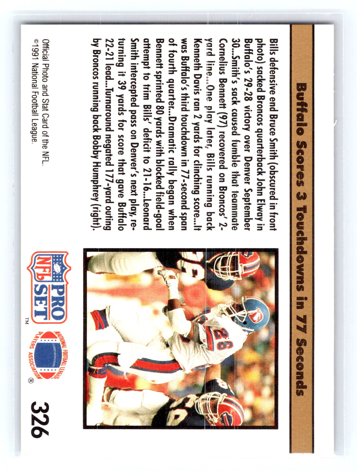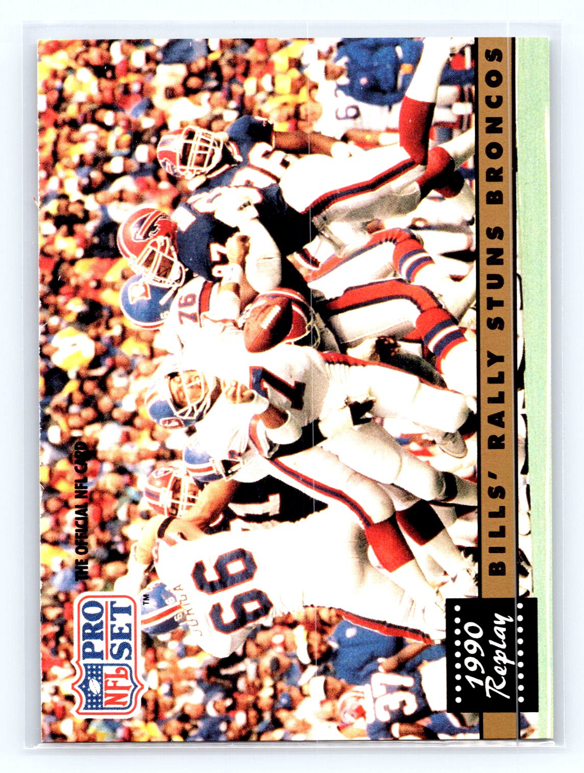 Other important information about this card: REP Bills Rally Stuns Broncos ERR NFLPA logo missing on back;.