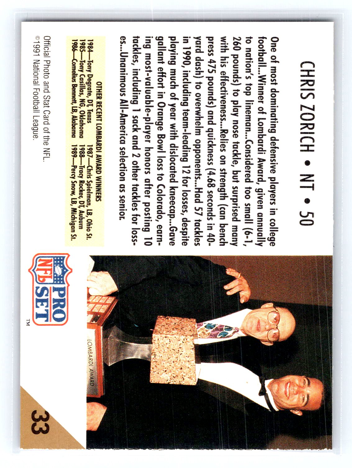 This is a really nice example of a 1991 Pro Set #33 Chris Zorich .