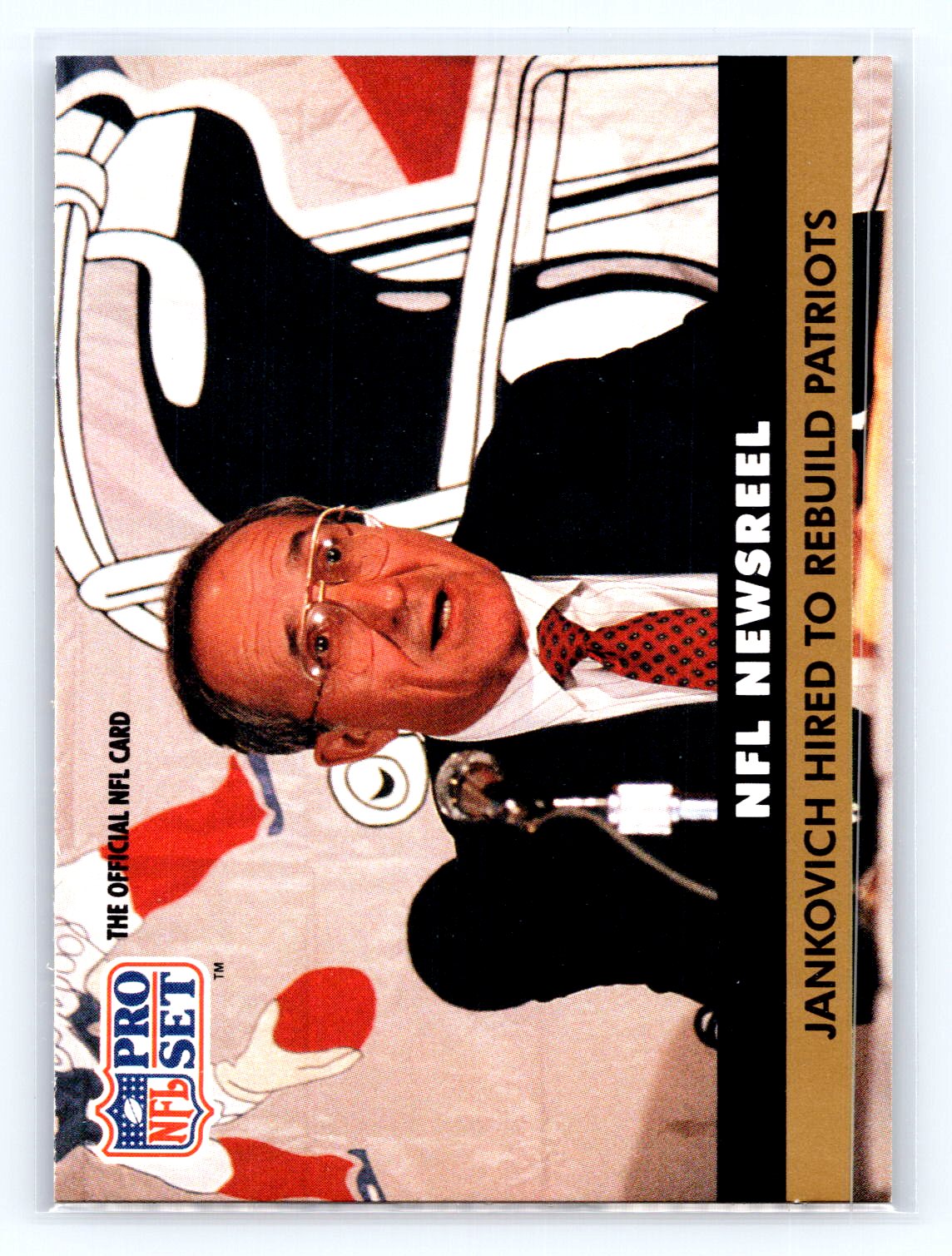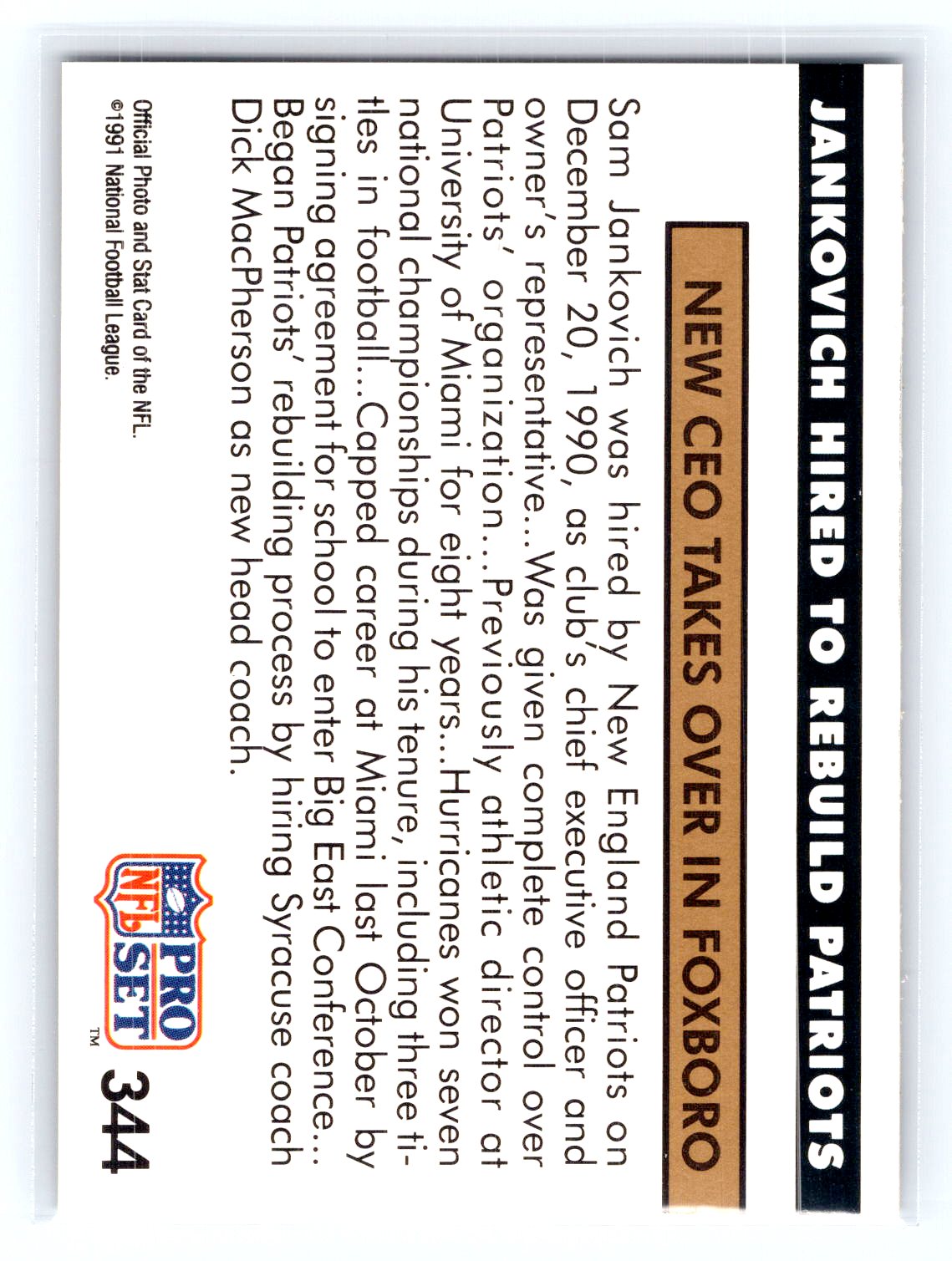 This is a really nice example of a 1991 Pro Set #344 Jankovich Hired to Rebuild Patriots .