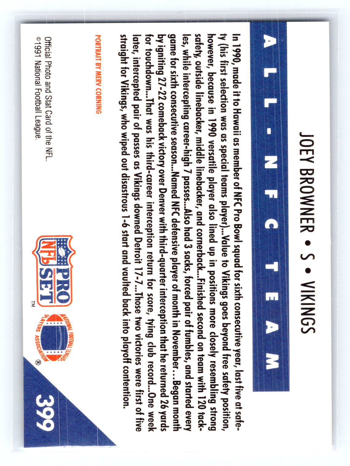 This is a really nice example of a 1991 Pro Set #399 Joey Browner .
