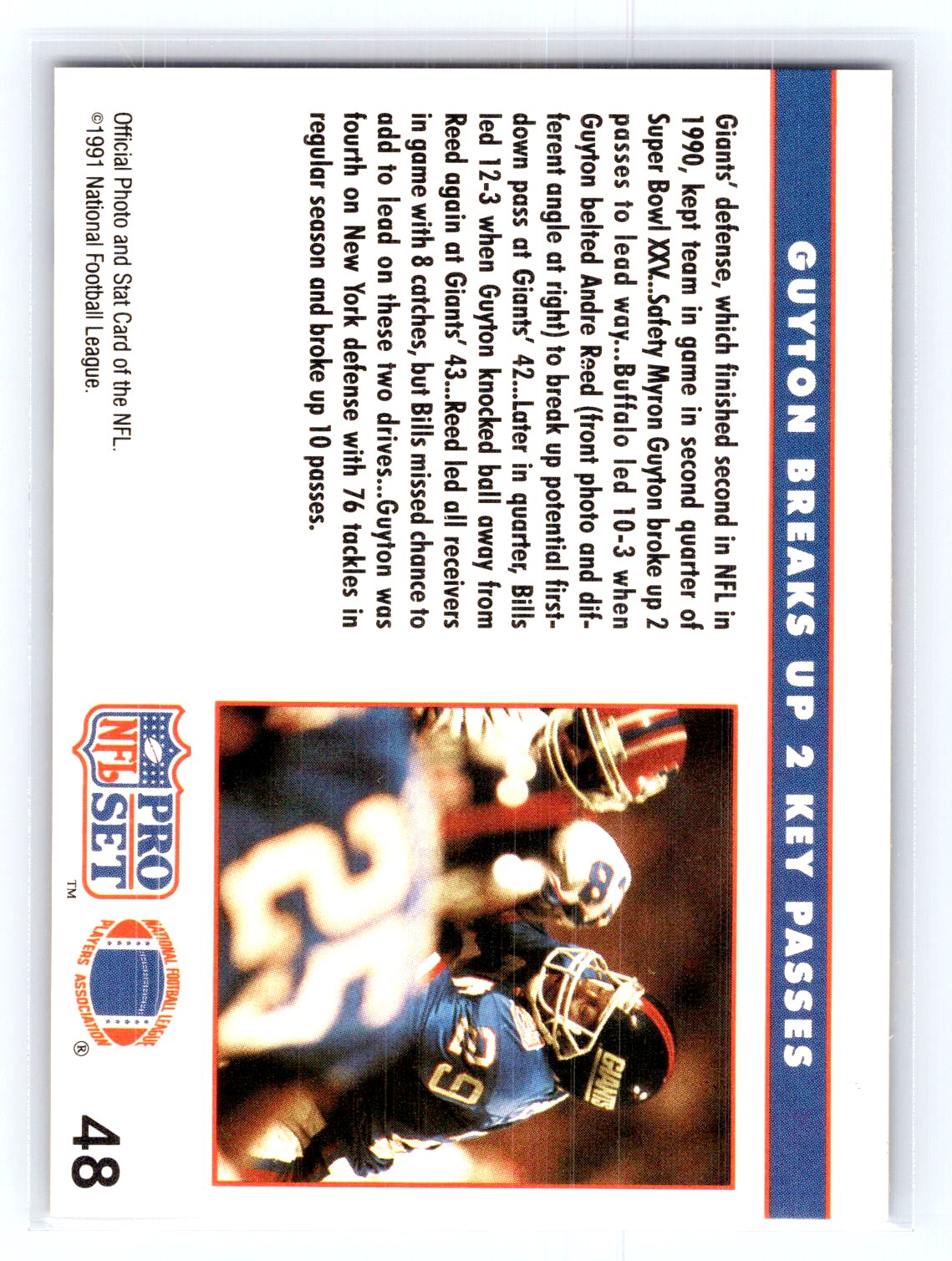 This is a really nice example of a 1991 Pro Set #48 Guyton Breaks Up 2 Key Passes .