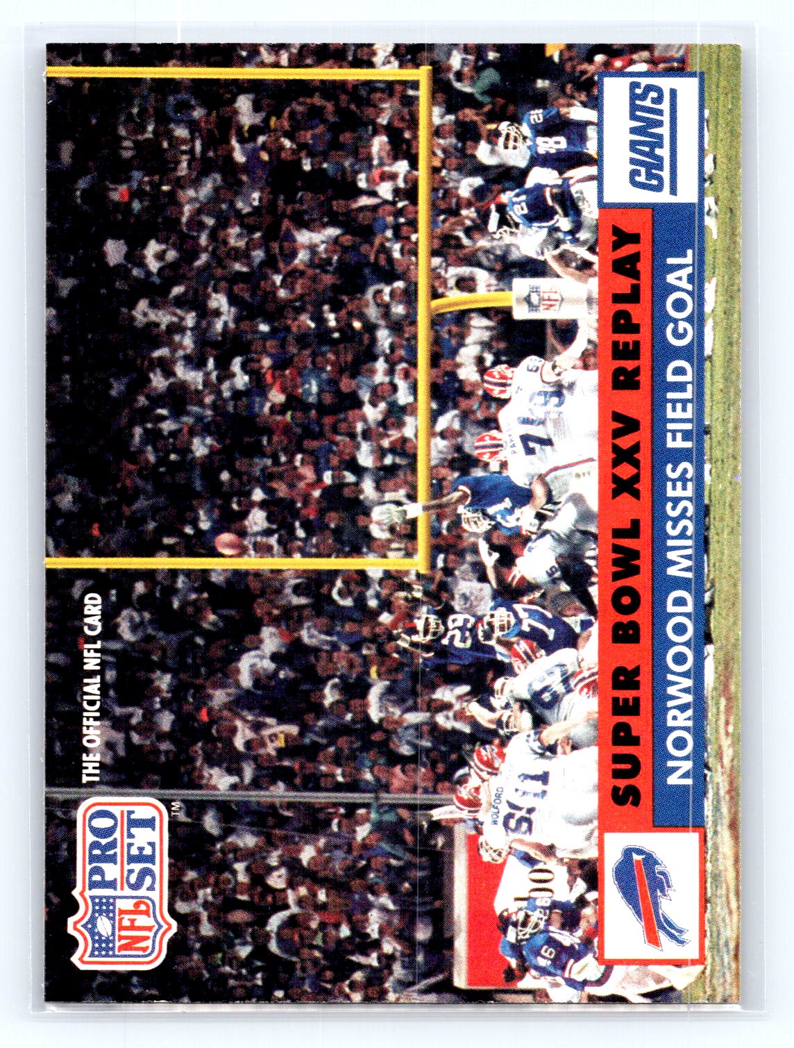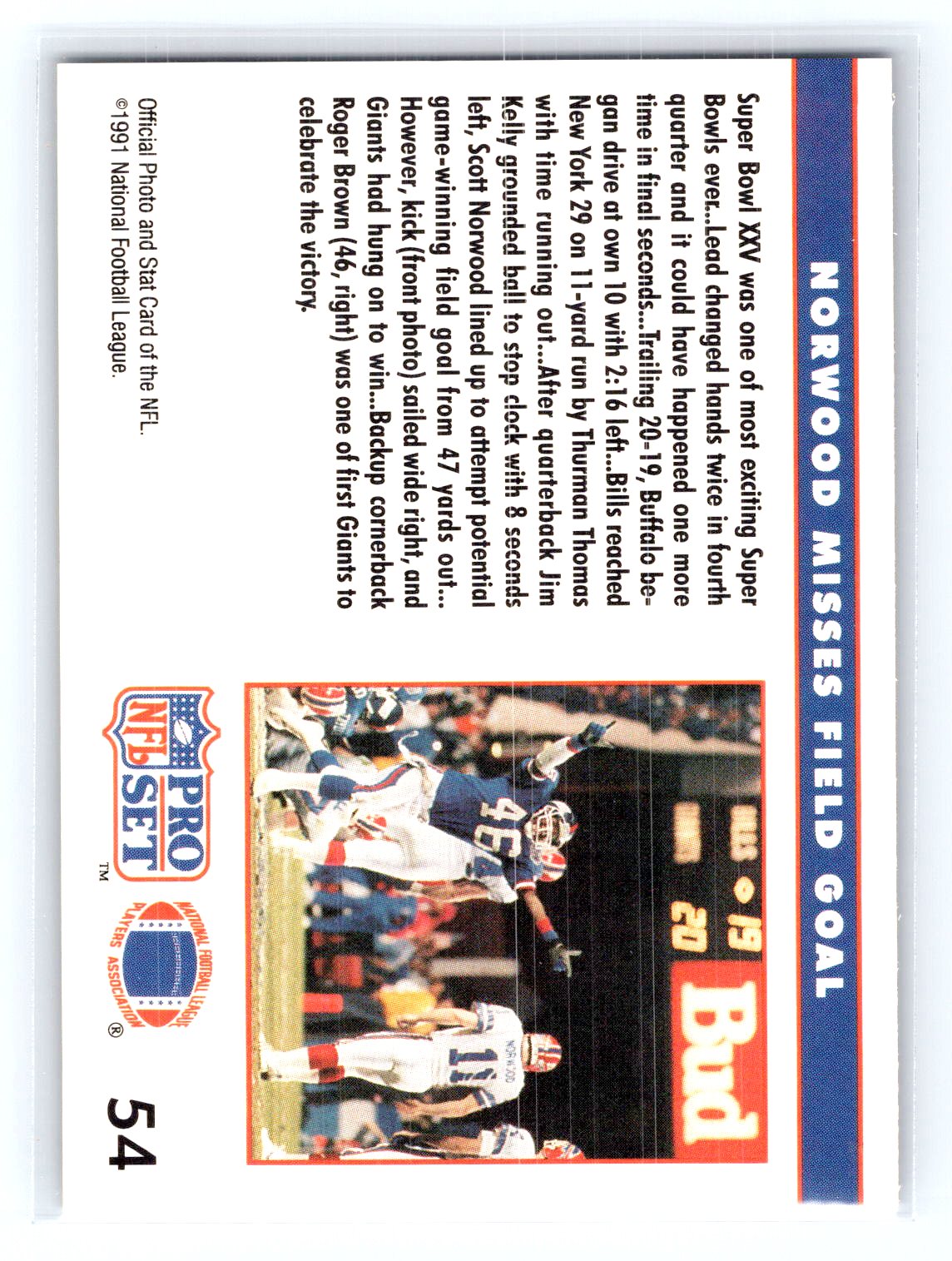 This is a really nice example of a 1991 Pro Set #54 Norwood Misses Field Goal .