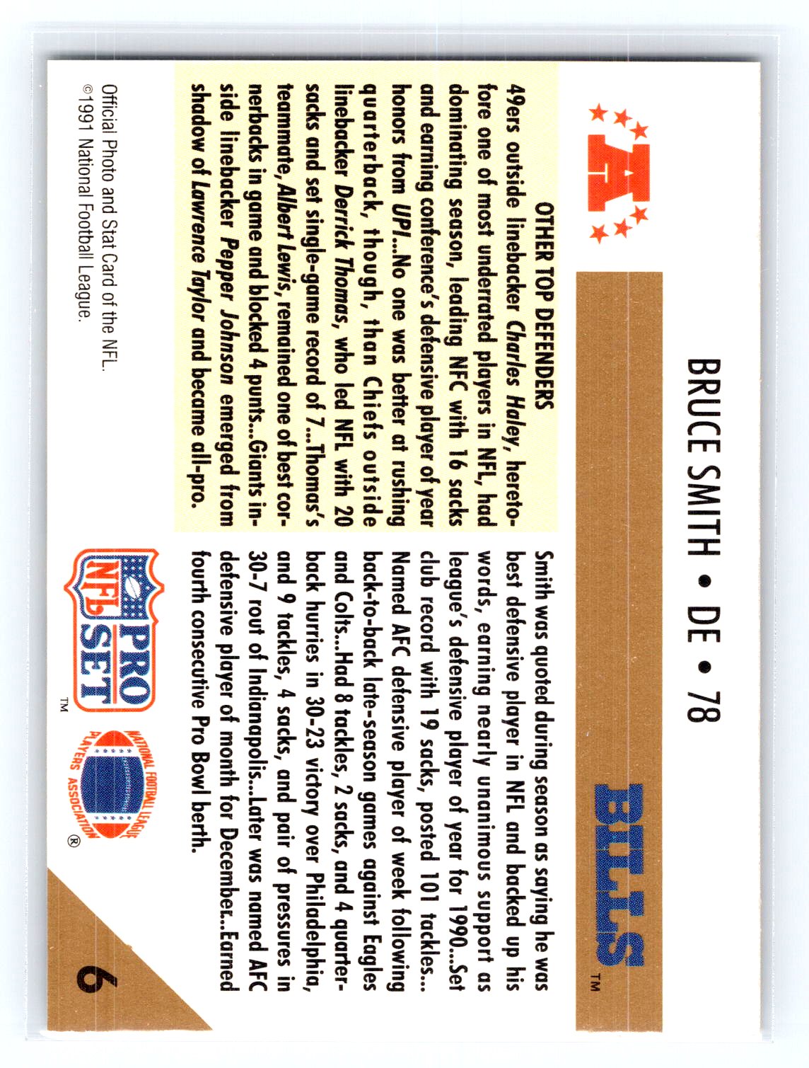 This is a really nice example of a 1991 Pro Set #6 Bruce Smith .
