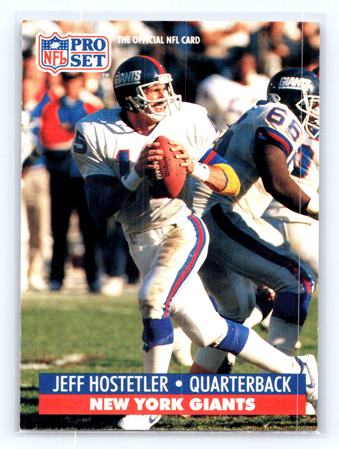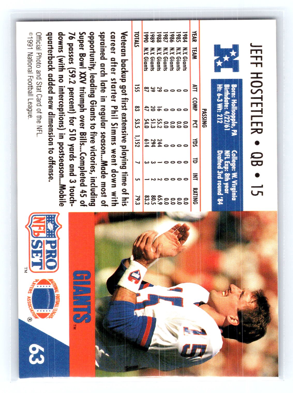 This is a really nice example of a 1991 Pro Set #63 Jeff Hostetler .