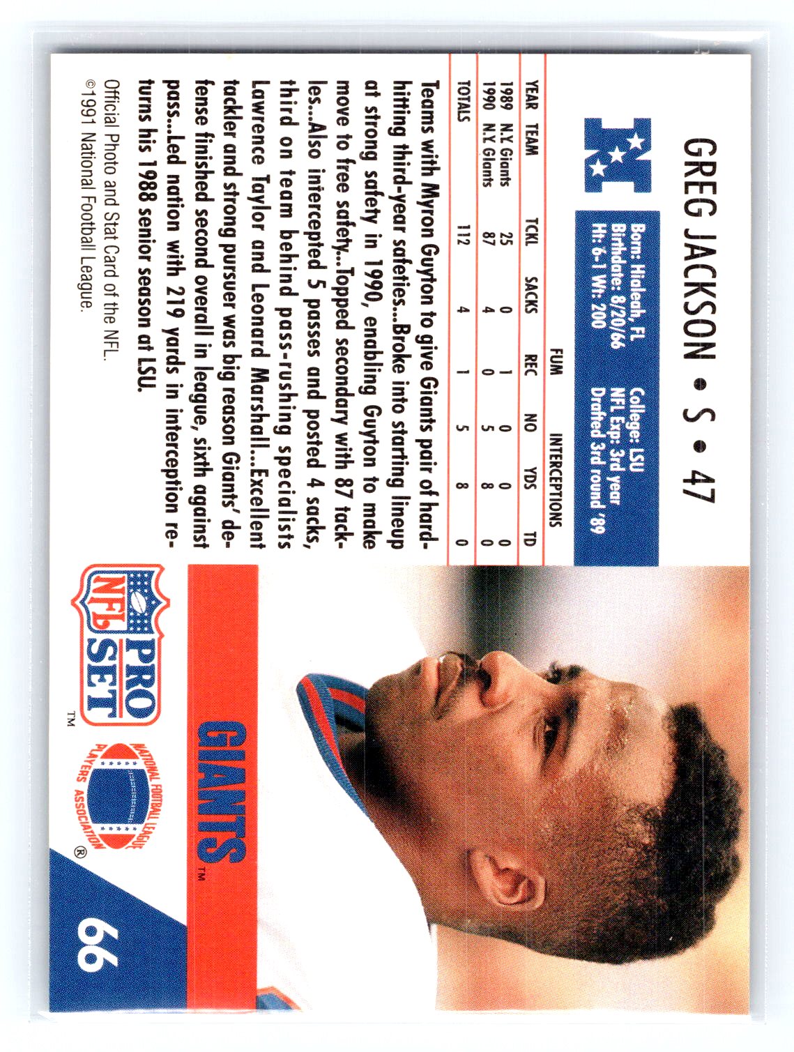 This is a really nice example of a 1991 Pro Set #66 Greg Jackson .