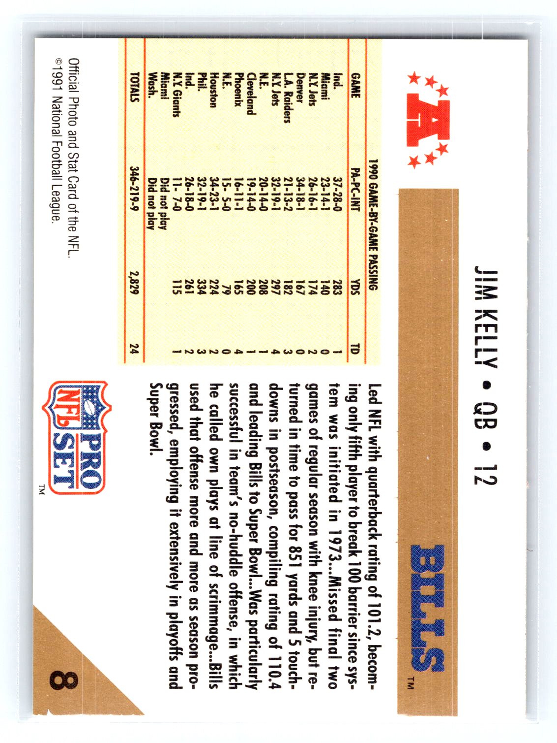 This is a really nice example of a 1991 Pro Set #8c Jim Kelly .