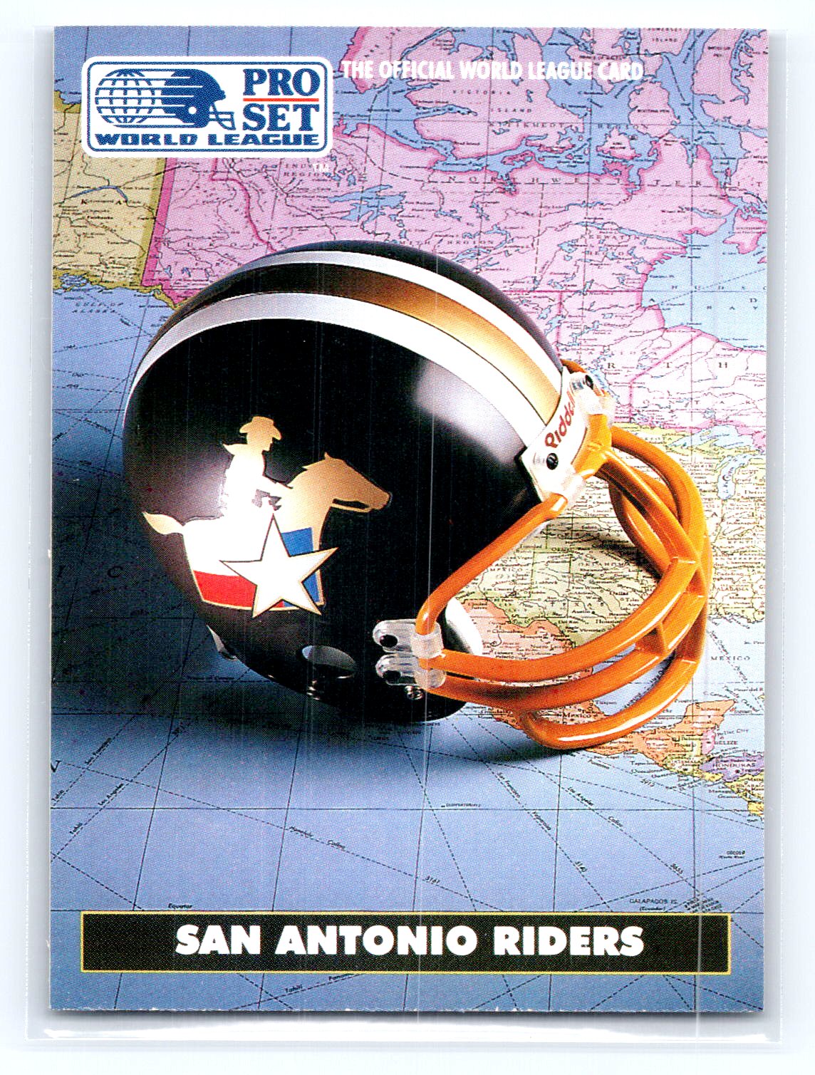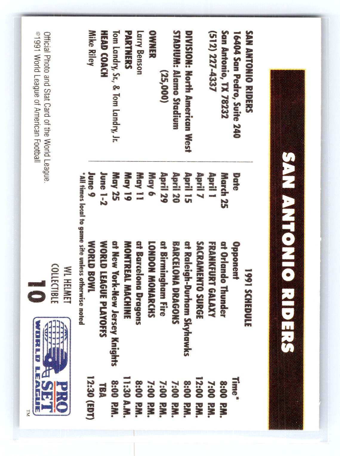 This is a really nice example of a 1991 Pro Set WLAF #10 San Antonio Riders Helmets.