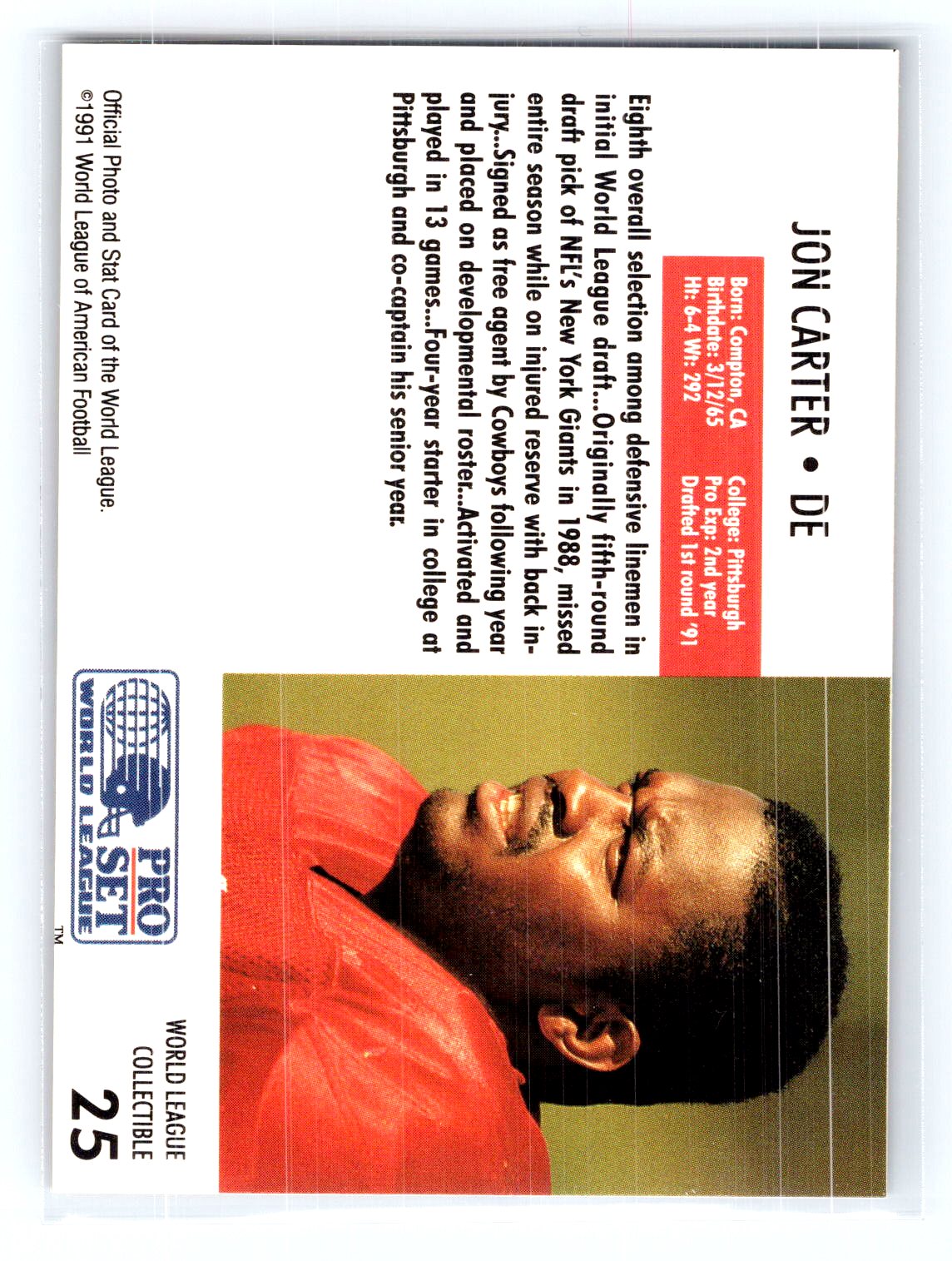 This is a really nice example of a 1991 Pro Set WLAF World Bowl Combo #25 John Carter .