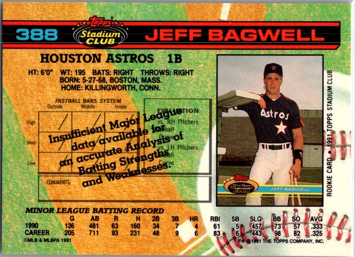 This is a really nice example of a 1991 Stadium Club #388 Jeff Bagwell .