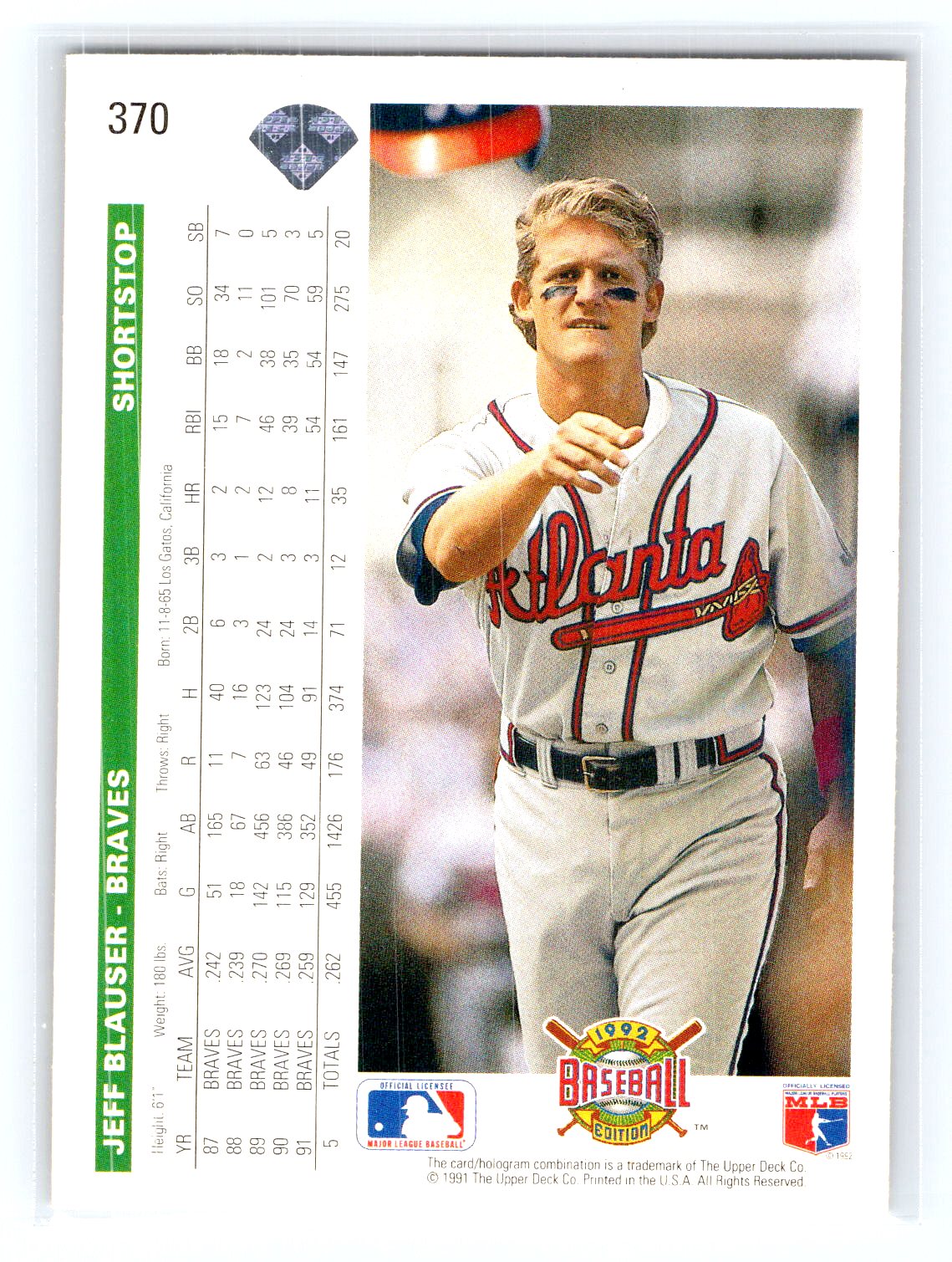 This is a really nice example of a 1992 Upper Deck #370 Jeff Blauser .
