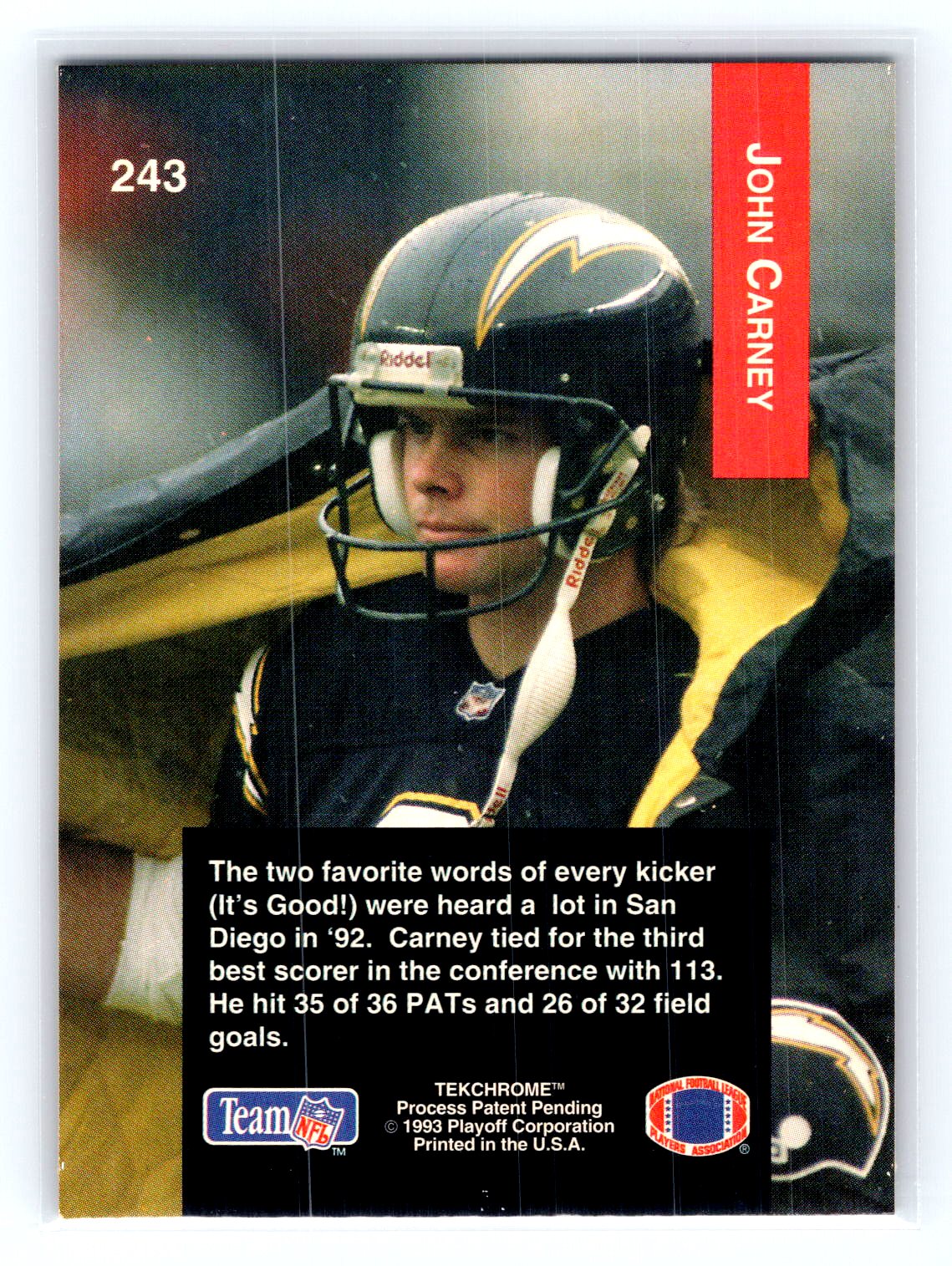 This is a really nice example of a 1993 Playoff #243 John Carney .
