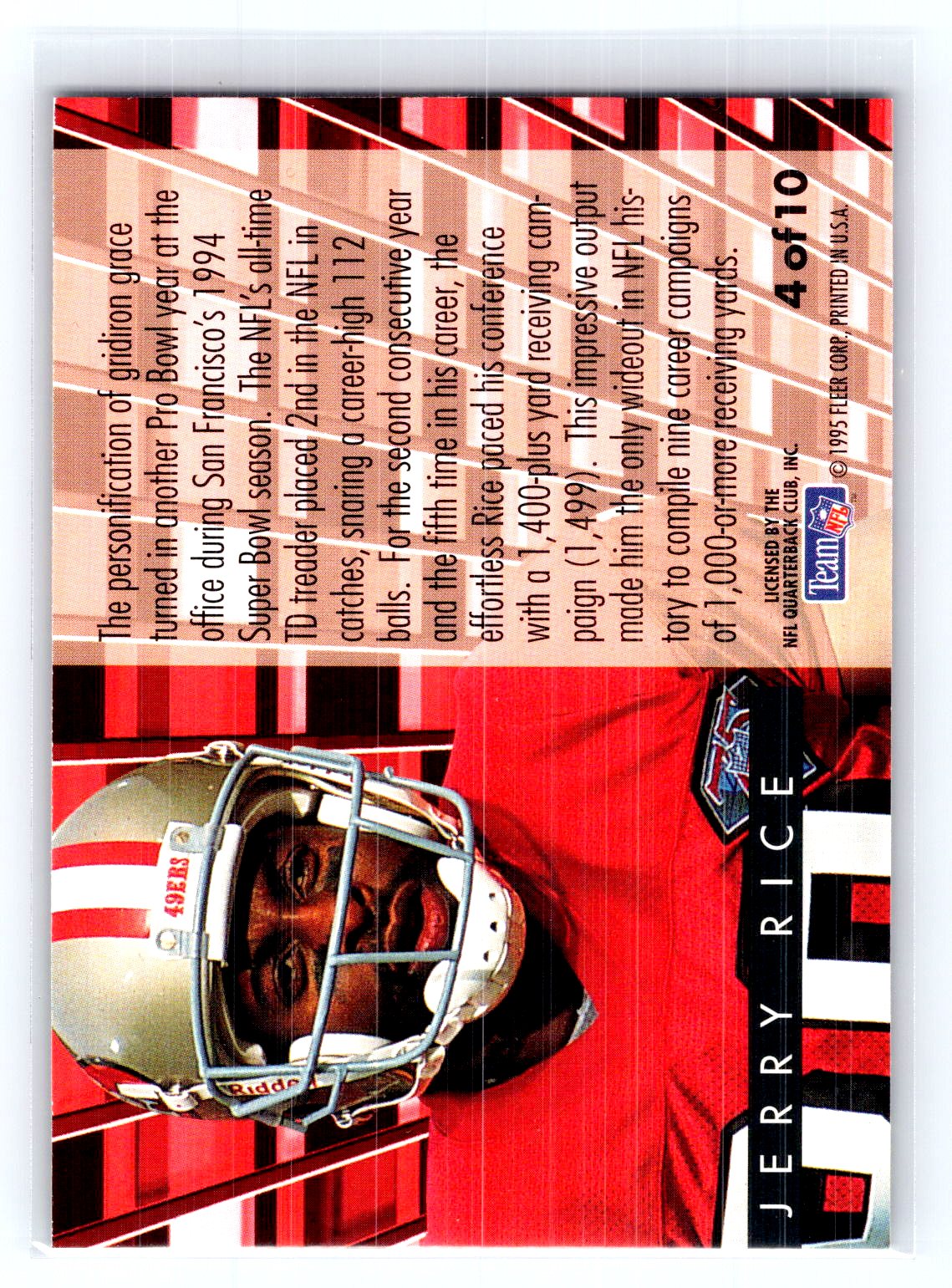 This is a really nice example of a 1995 Fleer #4 Jerry Rice Gridiron Leaders.