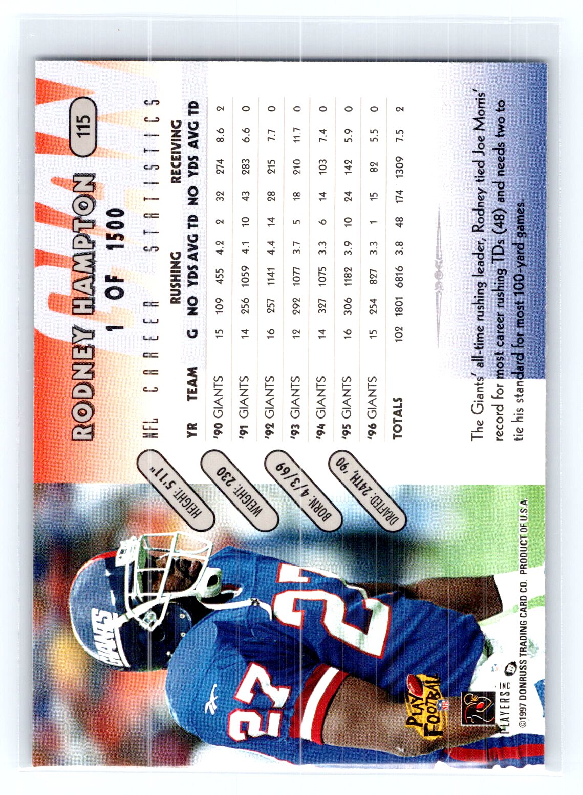 This is a really nice example of a 1997 Donruss #115 Rodney Hampton Press Proofs Silver.