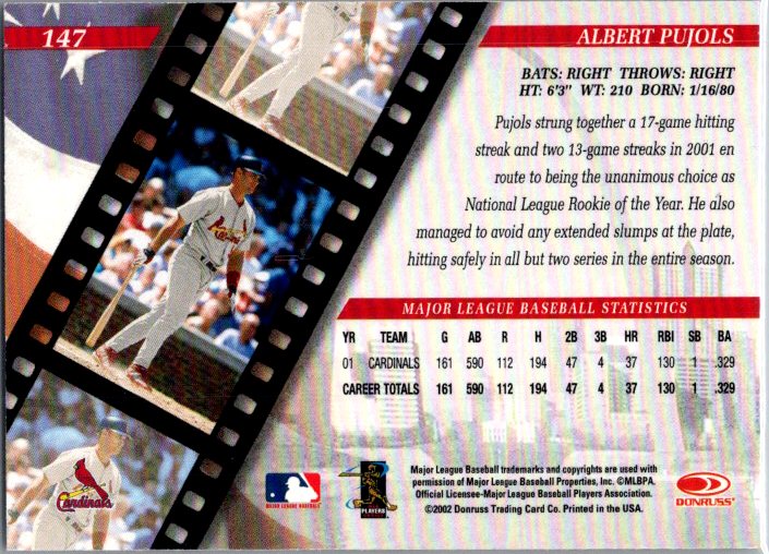 This is a really nice example of a 2002 Donruss Studio #147 Albert Pujols .