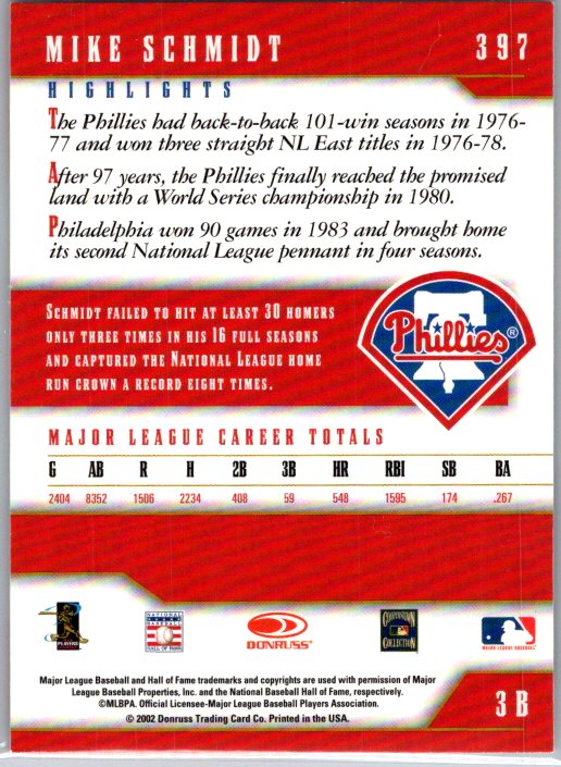This is a really nice example of a 2003 Donruss Team Heroes #397 Mike Schmidt .
