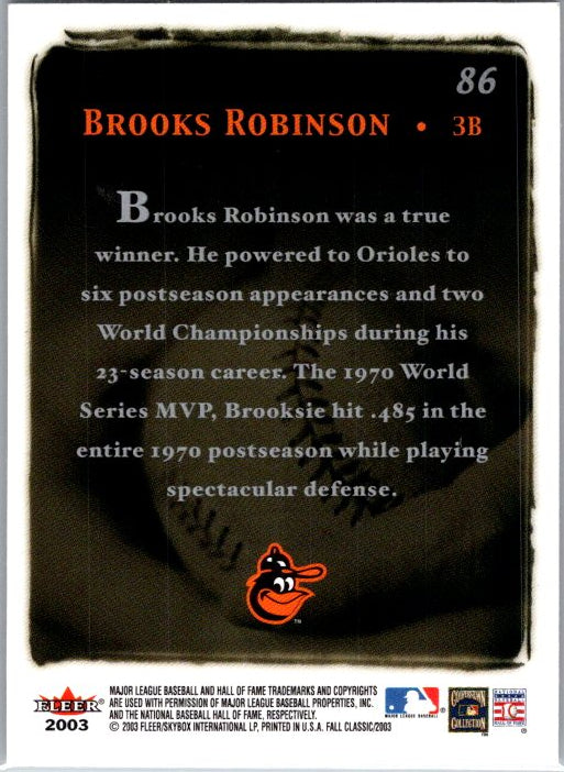 This is a really nice example of a 2003 Fleer Fall Classic #86 Brooks Robinson .