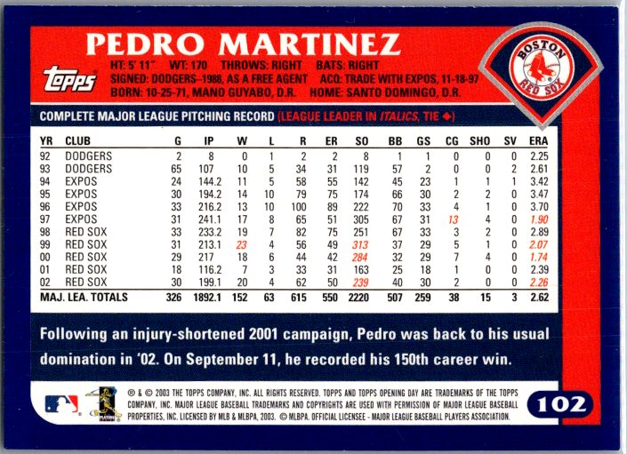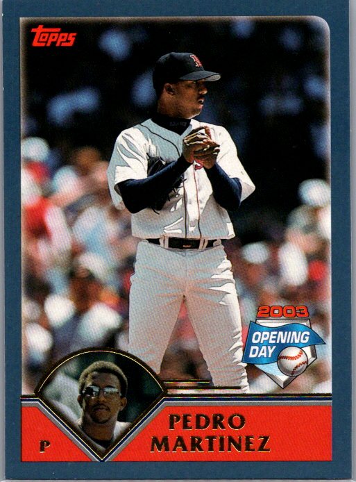 This is a really nice example of a 2003 Topps Opening Day #102 Pedro Martinez .