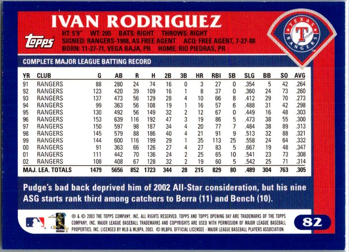 This is a really nice example of a 2003 Topps Opening Day #82 Ivan Rodriguez .