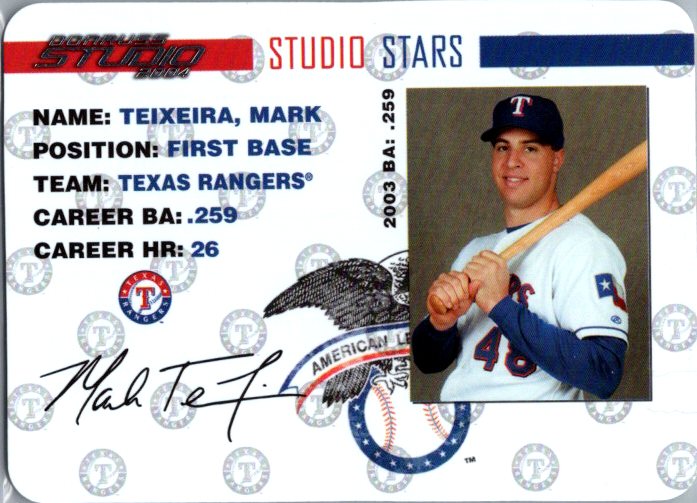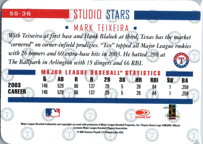 This is a really nice example of a 2004 Donruss Studio #SS-36 Mark Teixeira Stars.
