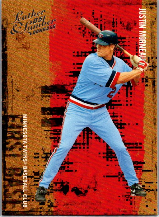This is a really nice example of a 2005 Donruss Leather & Lumber #77 Justin Morneau .