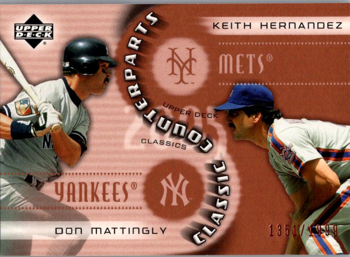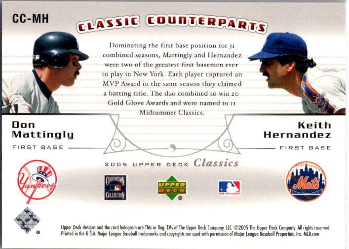 This is a really nice example of a 2005 Upper Deck Classics #CC-MH Don Mattingly / Keith Hernandez Counterparts.