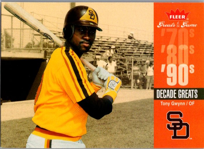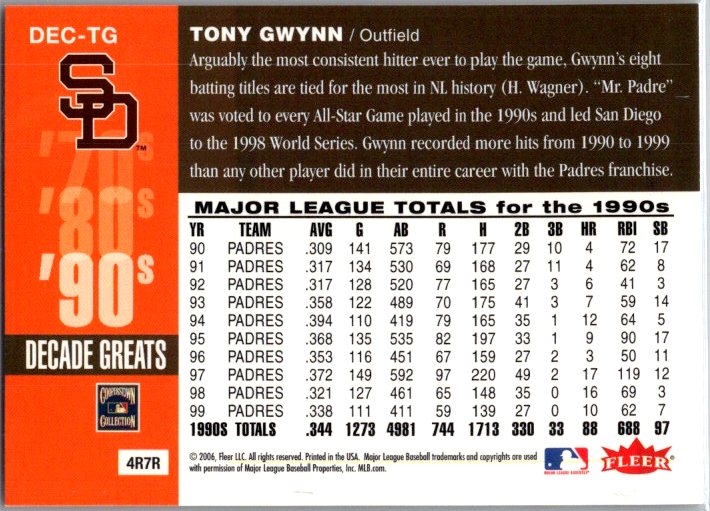 This is a really nice example of a 2006 Fleer Greats of the Game #DEC-TG Tony Gwynn Decade Greats.