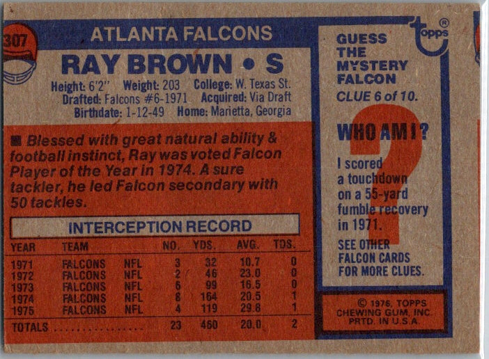 In 1976 Ray Brown played for the Atlanta Falcons.