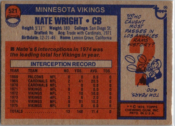 1976 Topps #521 Nate Wright