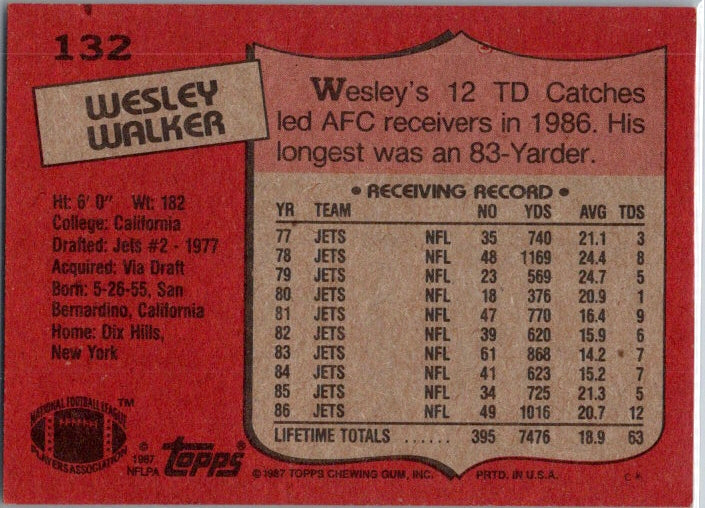 In 1987 Wesley Walker played for the New York Jets.
