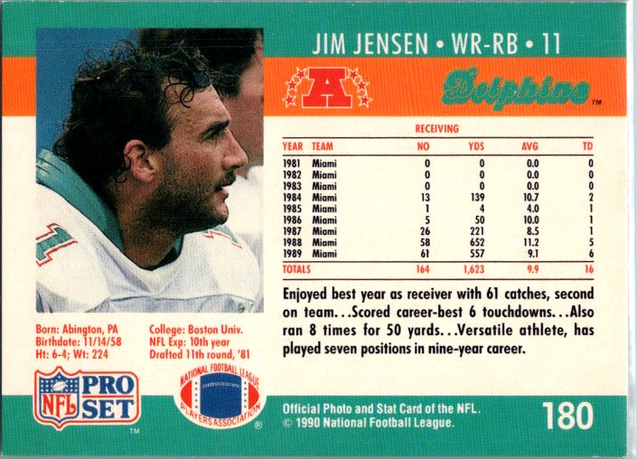 In 1990 Jim Jensen played for the Miami Dolphins.