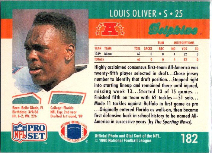 This is a really nice example of a 1990 Pro Set #182 Louis Oliver .