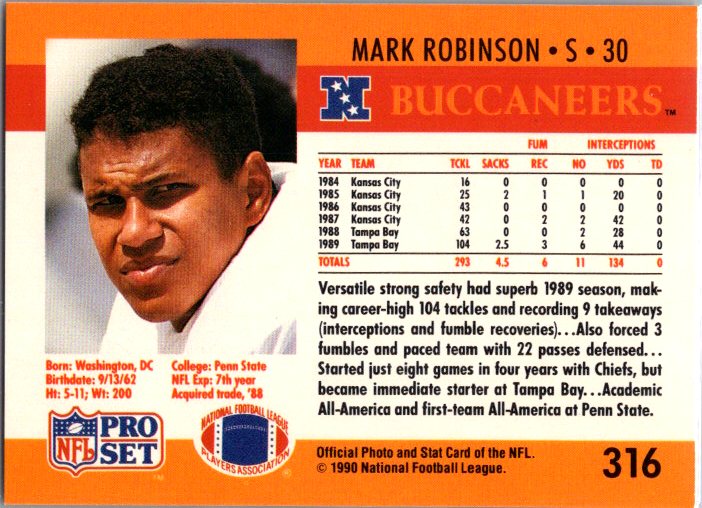 In 1990 Mark Robinson played for the Tampa Bay Buccaneers.
