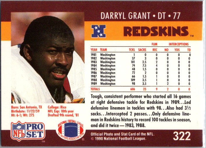 This is a really nice example of a 1990 Pro Set #322 Darryl Grant .