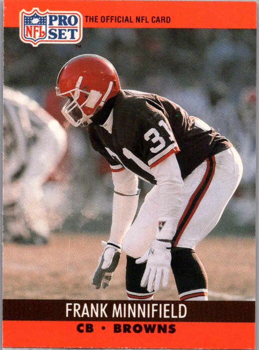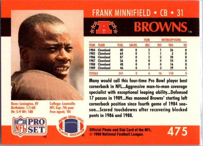 This is a really nice example of a 1990 Pro Set #475 Frank Minnifield .