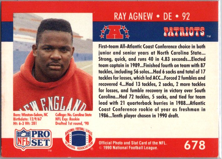 This is a really nice example of a 1990 Pro Set #678 Ray Agnew .
