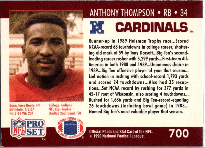 This is a really nice example of a 1990 Pro Set #700 Anthony Thompson .