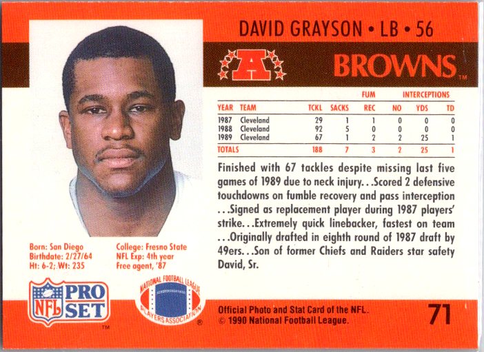 This is a really nice example of a 1990 Pro Set #71 David Grayson .