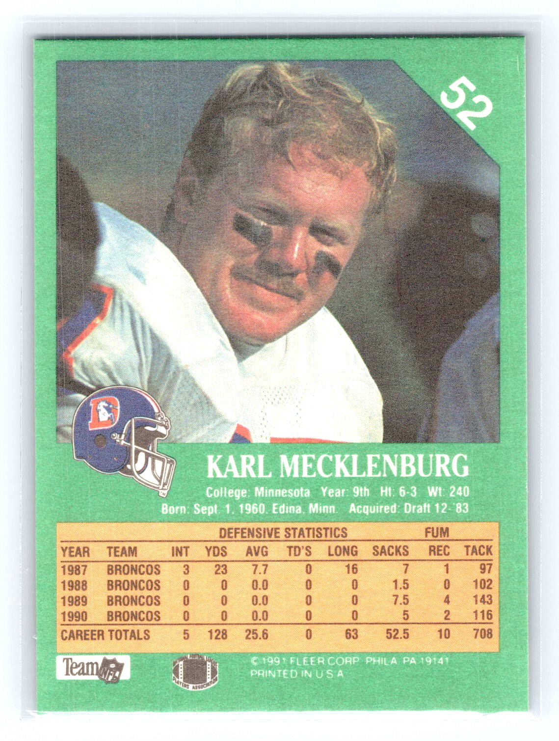 In 1991 Karl Mecklenburg played for the Denver Broncos.