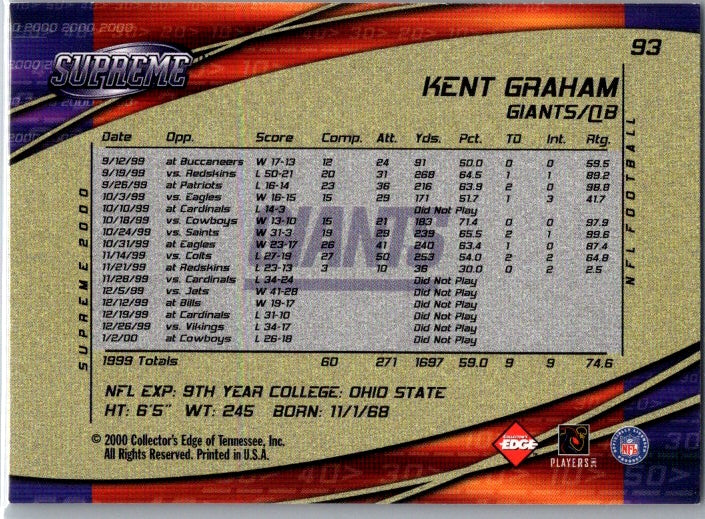 This is a really nice example of a 2000 Collector's Edge Supreme #93 Kent Graham .