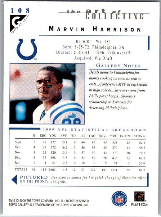 This is a really nice example of a 2000 Topps Gallery #108 Marvin Harrison .