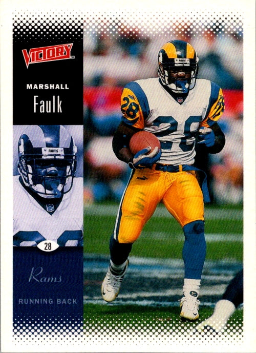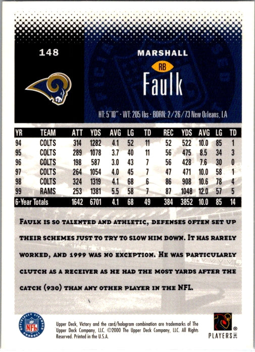 This is a really nice example of a 2000 Upper Deck Victory #148 Marshall Faulk .