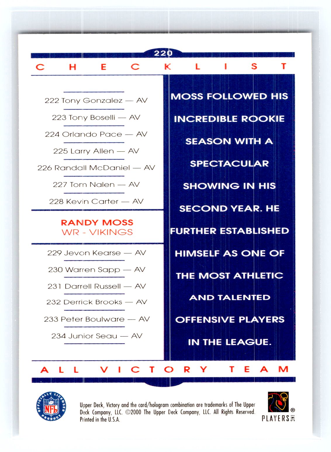 This is a really nice example of a 2000 Upper Deck Victory #220 Randy Moss .